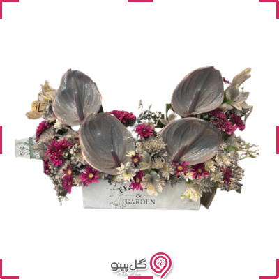 | تعداد گل | شامل حداقل 3 شاخه گل آنتوریوم، 2 دسته داوودی و 4 شاخه آلسترومریا |