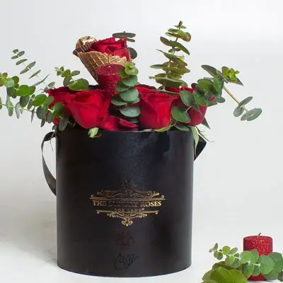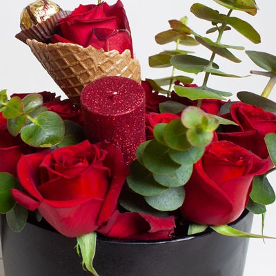 باکس گل آرشین شامل گل رز هلندی قرمز، برگ های اکالیپتوس، نان بستنی، شکلات شونیز و یک عدد شمع اکلیلی می باشد.