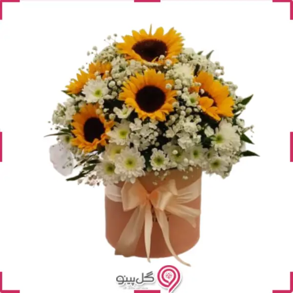 *باکس گل متشکل از گل ژیپسوفیلا، گل پنبه، گل آفتابگردان و لیسیانتوس