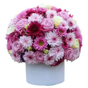 این باکس گل زیبا از گل های داودی و رز تشکیل شده.