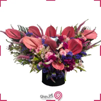 | تعداد گل | شامل حداقل 9 شاخه آنتریوم، 4 شاخه رز، 1 دسته آلسترومریا، 1 دسته میخک، 1 دسته استاتیس |