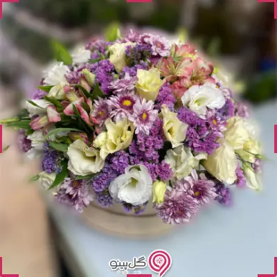 *باکس گل متشکل از گل لیسیانتوس، میخک، آلسترومریا و داوودی