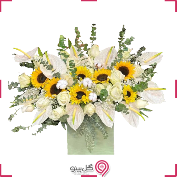 باکس گل مرسده شامل حداقل 10 شاخه آنتوریوم، 11 شاخه رز، 7 شاخه آفتابگردان می باشد.