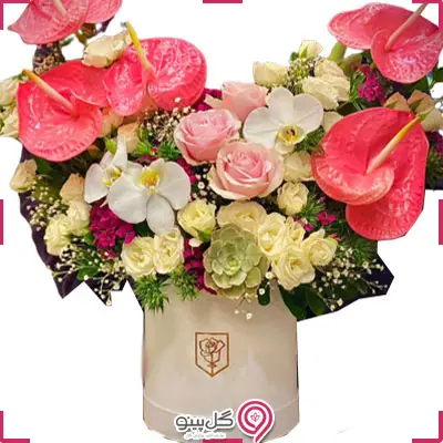 باکس گل متشکل از رز هلندی، ارکیده، عروس، قرنفیل، آنتوریوم