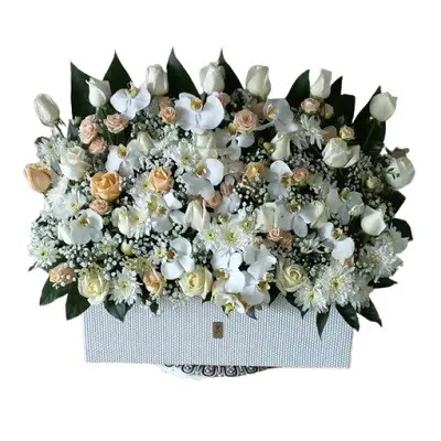 باکس گل هورام شامل شامل 7 عدد گل ارکیده، 2 دسته داوودی یا لیسیانتوس ، 1 دسته ژیپسوفیلا و 40 شاخه رز هلندی می باشد.