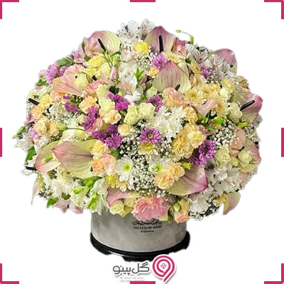 باکس گل پریسا شامل حداقل 27 داوودی، 10 آلسترومریا، 28 میخک، یک دسته ژیپسوفیلا، 6 عدد آنتریوم  در شهر یزد قابل ارائه میباشد.