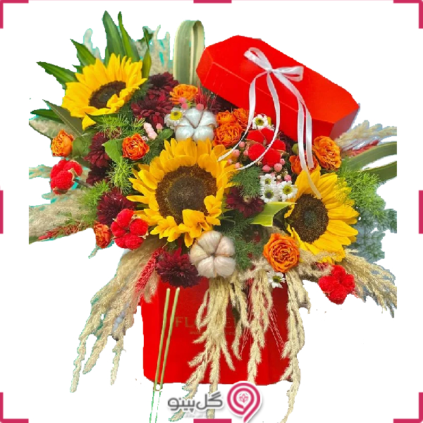 باکس گل کادین با گل های آفتابگردان، لیسیانتوس، داوودی یکی از انواع دسته گل و گل تبریک قابل سفارش در سایت گل پینو است. با تغییر کامل رنگ بندی گل ها و استفاده از رنگ گل های سفید، کرم، زرد و… استفاده از این دسته گل به منظور گل ترحیم امکان پذیر می شود. در صورت نیاز به تغییر این موارد و یا سفارش گل در تهران و سایر استان ها با تیم پشتیبانی گل پینو در ارتباط باشید.