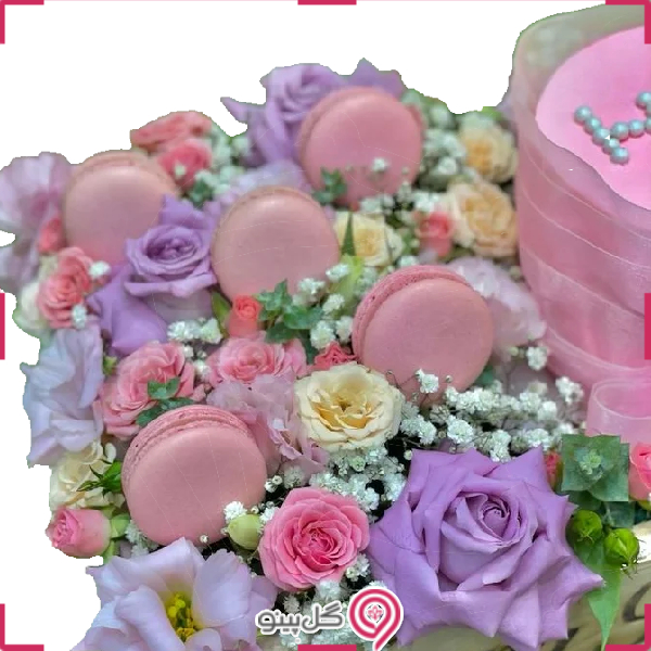*باکس گل کیک و ماکارون فریدا شامل حداقل 3 شاخه رز، 1 دسته لیسیانتوس، 1 دسته ژیپسوفیلا به همراه کیک می باشد.
