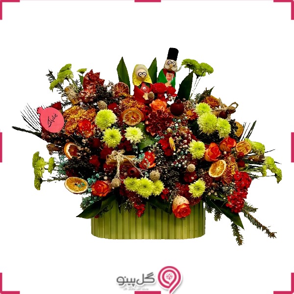 باکس گل یلدایی ویونا شامل حداقل 6 شاخه گل رز هلندی، 2 دسته گل داوودی، 1 دسته گل خشک، 1دسته گل قرنقول و 1 دسته ژیپسوفیلا به همراه میوه خشک، چوب دارچین، عروسک تزیینی می باشد. ثبت سفارش برای شهرهای متفاوت با هماهنگی تیم پشتیبانی گل پینو امکان پذیر است.