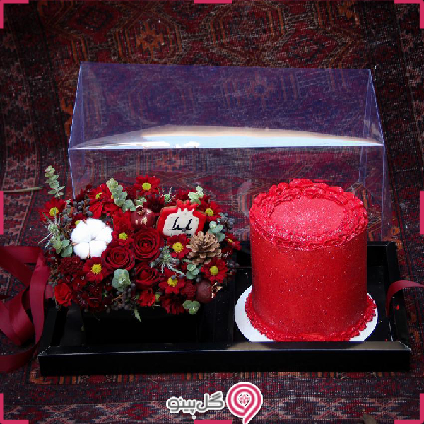 *باکس گل یلدایی کیمیا شامل 2 دسته رز مینیاتوری، 1 دسته داوودی مینیاتوری، گل پنبه به همراه کیک 1.5 کیلویی خانگی می باشد.