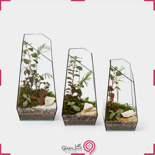 *تراریوم نیلا با شیشه دست ساز یکی از انواع تراریوم و گیاهان و گلدان های آپارتمانی گل پینو است.
