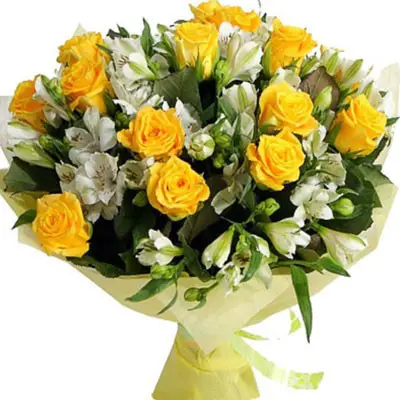 این دسته گل زیبا متشکل از گل های رز زرد و آلسترومریای سفید است.