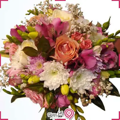 *دسته گل متشکل از گل های آلسترومریا، رز، داوودی و ژیپسوفیلا