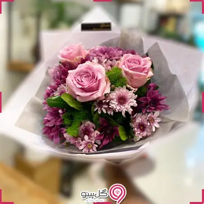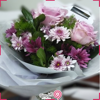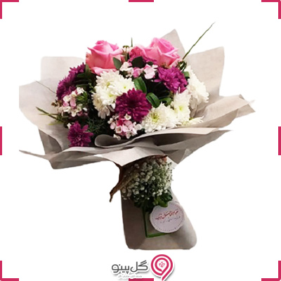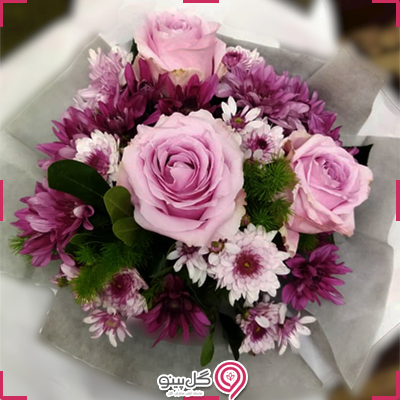 دسته گل متشکل از رز هلندی، داودی، قرنفیل