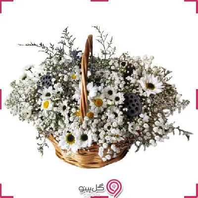 *سبد گل متشکل از گل های مارگریت، ژیپسوفیلا و پسته دریایی