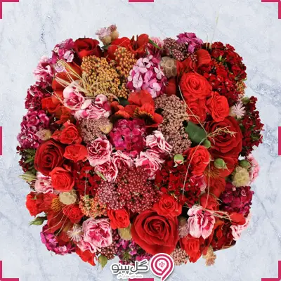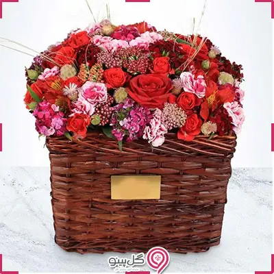 سبد گل رز قرمز از گل های رز، قرنفل، داودی تشکیل شده که همگی در طیف رنگ قرمز وصورتی هستند.