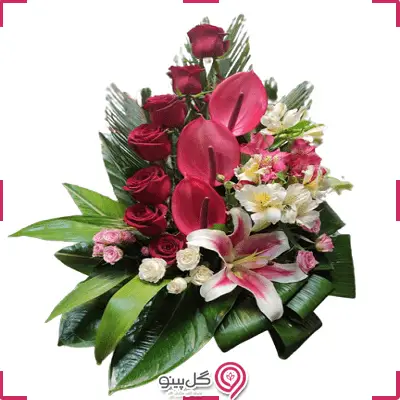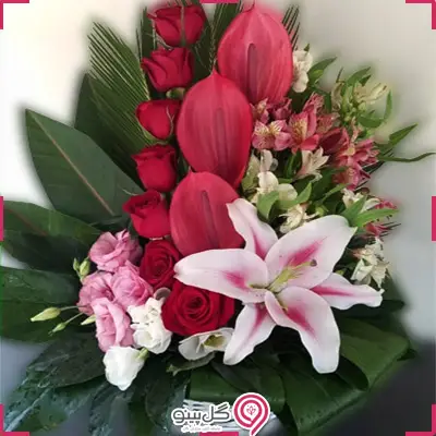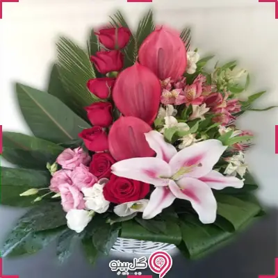 *سبد گل متشکل از رز، آنتریوم، لیلیوم، آلسترومریا