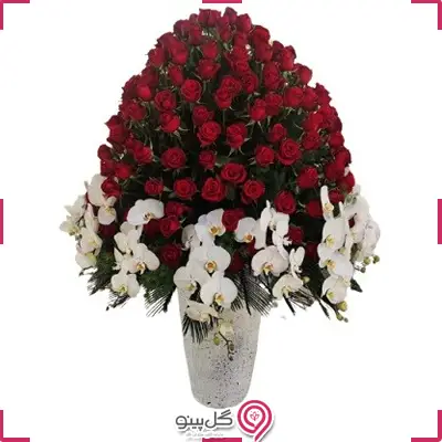 تعداد گل شامل حداقل 6 شاخه گل رز هلندی و 65 شاخه گل ارکیده