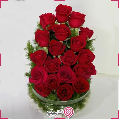 * این گلدان شیشه ای متشکل از 17 شاخه گل رز ایرانی با رنگ قرمز است.